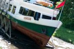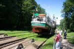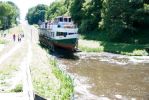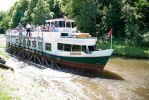 Wygląda to bardzo ciekawie. Statki wpływają na wózki, które mają koła i poruszają się po torze kolejowym. Wózki są dwa, gdy jeden jedzie do góry w tym sama mym czasie drugi, po torze obok zjeżdża w dół. W taki sposób podróż odbywa się w dwóch kierunkach. Wózki są zanurzone w wodzie, aby statki mogły swobodnie na nie wpłynąć i zacumować. W tym czasie obsługa przywiązuje linkami statek do bocznych ram. Gruba, stalowa lina wciąga statek w górę na szczyt wzniesienia i potem powoli opuszcza go w dół. Linia jest umocowana w zamkniętym obiegu i wspomagana ustawionymi po środku małymi kółkami, a na końcach dużymi kołami przepuszczającymi linie. Wszystko jest napędzane w maszynowni, gdzie na bęben linia się zwija z jednej strony a z drugiej odwija.