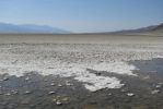 Kolejne miejsce, w którym się zatrzymujemy to najniżej położone miejsce na całej półkuli zachodniej- 282 feet/ 85,5 metrów poniżej poziomu morza. Teoretycznie powinno być też najgorętsze i chyba tak jest. Ale co dziwne- czuję się dużo lepiej niż w Zabriske Point. Widok przepiękny- rozległa płaska dolina otoczona ze wszystkich stron wysokimi górami. I właśnie takie ukształtowanie tego obszaru odpowiada za tak wysokie temperatury. Otaczające góry zatrzymują chłodniejsze i wilgotne powietrze na zewnątrz tego rejonu a w samej Dolinie Śmierci bezchmurne niebo, niskie położenie (a wiadomo, że im wyżej tym chłodniej) i silne promieniowanie słoneczne robią swoje. Na dnie doliny- o dziwo- woda, ale z wysadami solnymi, czyli strasznie słona, a także rośliny- słonorośla. Nie dla wszystkich organizmów jest to więc dolina śmierci. Na wprost najniżej położonego punktu jest ściana skalna, na której zaznaczony jest poziom morza- dopiero teraz widać jak jesteśmy nisko. 85,5 metra pod wodą powoduje tak duże ciśnienie, że niewiele osób- w tym nurków- było na tej głębokości. Jedynie ci doświadczeni schodzą na takie głębokości. A tu? Luzik. Do tego charakterystycznego miejsca dochodzi się po specjalnym pomoście, ale później można już zejść na ziemię. I wtedy obserwuję coś dziwnego- jajka na ziemi. Już wiem o co chodzi. Rozbijając je na ziemi szybko się ścina białko. My niestety swojego nie wzięliśmy, ale „pościnane” leżały. Pierwsi osadnicy jadący na zachód Ameryki byli świetnie przygotowani do trudnych warunków- wiedzieli gdzie i jak szukać wody, poza tym byli to twardzi ludzie. Jednak Dolina Śmierci zaskoczyła ich i wielu z nich pozostało tu na zawsze.