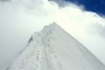 Totalna euforia dopadła mnie później, podczas monotonii schodzenia. Trwałem w niej jeszcze, gdy dotarliśmy do Vallota. Usiadłem tylko opierając głowę na rękach. Nawet mi się nie chciało z nikim gadać, nawet się nie uśmiechałem, ale czułem się w środku totalnie spełniony i szczęśliwy. Tyle miesięcy czytania, planowania, przygotowań, zakupów i nareszcie. Wątpiłem czy uda nam się tego dokonać. Szczególnie, gdy wiatr się nasilał i widoczność też się totalnie załamała. Weszła nas piątka, w sumie jakby nie było z dziewięciu początkowo chętnych osób i z sześciu w naszym zespole. Ogólnie przyjęło się, że Mont Blanc jest prostą górą do zdobycia. Już po przejściu całej tej drogi przyznam, że faktycznie jest to prosta góra, ale jednocześnie może być niebezpieczna i jednak potrafi zmęczyć. Czas podejścia na ten szczyt mnie zaskoczył. Nie sądziłem, że droga na górę zajmie nam (w prawdzie z przerwami) aż prawie siedem godzin. Nie wątpliwy minus to na pewno mgła, choć w drodze na dół, może 100 metrów poniżej szczytu na chwile rozwiało chmury i przez minutę widzieliśmy fragmenty naprawdę ładnego krajobrazu dookoła. Wystarczyło, żeby na dodatkowy dowód sfotografować grań szczytu, którą jeszcze przed chwilą wchodziliśmy. Plusem natomiast jest to, że na szczycie byliśmy sami. Podejście w ciężkich warunkach, niewątpliwie kosztowało, ale mieć dach Europy tylko dla siebie – bezcenne J.