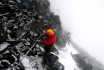 Ubezpieczenie samej grani stanowią stalowe trasery. W praktyce, są to pręty różnej wielkości wbite pionowo w skałę. Część z nich nie za bardzo trzyma się już skały i prosi o wymianę, jednak póki co zapewniają jeszcze wystarczającą asekurację dla całego zespołu. Do asekuracji z użyciem traserów teoretycznie potrzebne są taśmy lub repsznury z karabinkami. W rzeczywistości jednak wiele ekip z braku sprzętu (lub innych powodów), po prostu „okręca” linę wokół stalowego słupka idąc dalej w górę. My pierwszych kilka punktów zabezpieczyliśmy taśmami, a później żeby nie tracić czasu, przeplataliśmy linę przez punkty idąc powoli dalej. Pogoda nie jest najlepsza, widoczność może na 20 metrów, ale i tak na grani musieliśmy czekać aż miną nas w drodze na dół trzy ekipy, z czego jedna komercyjna.