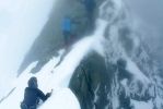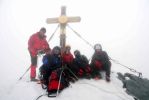 Po pół godziny wolnej wspinaczki, monotonnie pokonując kolejne punkty, w końcu docieramy do szczytu Kleinglockenra (3770m n.p.m. – o 28m niższy od Grosa). Widoczność bardzo mała, do tego wieje 30-40km/h, ale przynajmniej trochę się ociepliło, jest całe 6ºC. Z każdym mocniejszym podmuchem wiatru, drobne kryształki lodu wbijają się boleśnie w twarz. Niestety, teraz trzeba zejść kawałek w dół, na przełęcz zwaną Obere Glocknerscharte z dużą ekspozycją, na wysokości 3766m n.p.m. i wspiąć się ostatnim skalnym odcinkiem (32m w pionie), na najwyższy szczyt Austrii. Mozolnie pokonujemy ostatnie skały, uważając na mniej doświadczone dziewczyny z ekipy, aż nareszcie po 15 metrach teren nareszcie przechodzi w mniej stromy. Dla osób sprawnych we wspinaczce odcinek ten jest bardzo prosty i wycenić go można zaledwie na łatwe wspinaczkowe II, jednak osobom mało wprawionym może zająć sporo czasu. Tym bardziej, że miejscami zalega śnieg a sama wspinaczka odbywa się najczęściej w rakach, rękawiczkach i na sporej wysokości n.p.m. Tutaj już na samych nogach wchodzimy na małą, usianą wystającymi skałami połać śniegu i po chwili przez gęstą, nieustannie przelatującą mgłę widzimy kontur krzyża przytwierdzonego do skał za pomocą wyciągów. Ostatnie kroki i przypinamy się bezpiecznie do stalowej konstrukcji. O 10:53 po 5:31h od wyjścia z dolnego schroniska piątka zdobywców staje na najwyższym szczycie Austrii. Nie jest bardzo zimno, całe 3ºC, ale silnie wiejący wiatr sprawia, że odczuwamy dużo mniej i na wszystkim osiada szron. Warstwa chmur nie może być duża, bo jest bardzo jasno jak na takie zachmurzenie. Nie zabawiamy tu długo, wyciągam z plecaka resztę niedopitej wiśniówki z poprzedniego dnia. Wystarcza w sam raz dla każdego po łyku, na rozgrzanie. Robimy sobie wspólne zdjęcie i klarujemy linę do zejścia. Anka i Kaśka pójdą pierwsze, potem ja, druga Kaśka i Rafał na końcu. W momencie gdy opuszczamy szczyt, gęsty dywan na chwilę się rozstępuje i przez parę sekund widać ciemnobłękitne niebo.