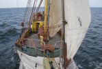 W trakcie powrotu do Bałtijska nie miałem nic sprawdzane, więc nie wiem, czy nadal jest to strefa zamknięta czy nie? W każdym bądź razie wachta przypadła mi na godziny nocne gdzie pilnowałem wejścia na żaglowiec. Co pewien czas podjeżdżał jakiś samochód stał jakąś chwilę po czym odjeżdżał. Dość dziwne. W kolejnym dniu było uroczyste rozpoczęcie regat na nabrzeżu, prezentacja nagród i oficjalne przemowy. Przy okazji odbył się festyn na którym mogliśmy porozmawiać z miejscowymi żołnierzami. Z ich relacji wynika, że służba już jest krótsza niż dawniej i trzeba wiele wysiłku w szkolenie żółtodziobów. Na placu defilad codziennie rano odbywają się ćwiczenia sprawnościowe, a przy każdym ćwiczeniu żołnierze wydają głośne okrzyki. Zakończenie regat odbyło się następnego dnia, a "Zawisza Czarny" wraz z motorówką sędziowską ustawił się w linii mety na otwartych wodach w pobliżu linii brzegowej. W związku z tym, że czekaliśmy na kotwicy na kolejne jachty, mieliśmy dużo czasu na kąpiel w morzu, podziwianie krajobrazów z bocianiego gniazda i inne rzeczy. Choć wcześniej o tym nie wspominałem, ale wyjazd był udany przede wszystkim ze względu na wspaniałych ludzi, którzy ze mną płynęli. Jest to szczególnie ważne na żaglowcach, gdzie przebywa się ze sobą 24h na dobę przez wiele dni. Jeszcze raz potwierdza się porzekadło: nie ważne gdzie, ważne z kim. W tym przypadku było "i z kim i gdzie". W drodze powrotnej do Gdyni trochę bujało i grzmiało, ale choroby morskiej chyba nikt nie odnotował. No i oczywiście podziękowania dla stałej załogi: kapitana, zastępcy, bosmana, maszynisty, kucharza....
